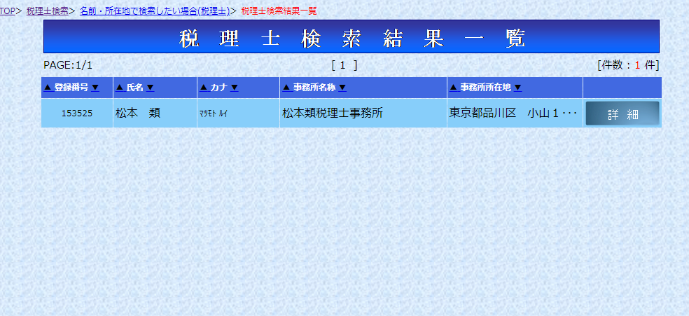 すると条件に該当する税理士の一覧が出てきますので、この人数を数えればその事務所にいる税理士の数がわかる!というわけです。