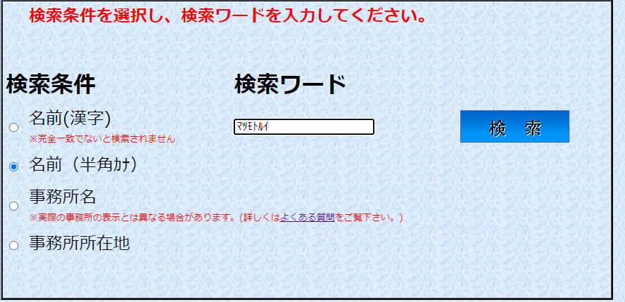 すると検索条件を指定するように画面上の指示が出てきますので、ここの「検索条件」の事務所名のラジオボタンを選択します。